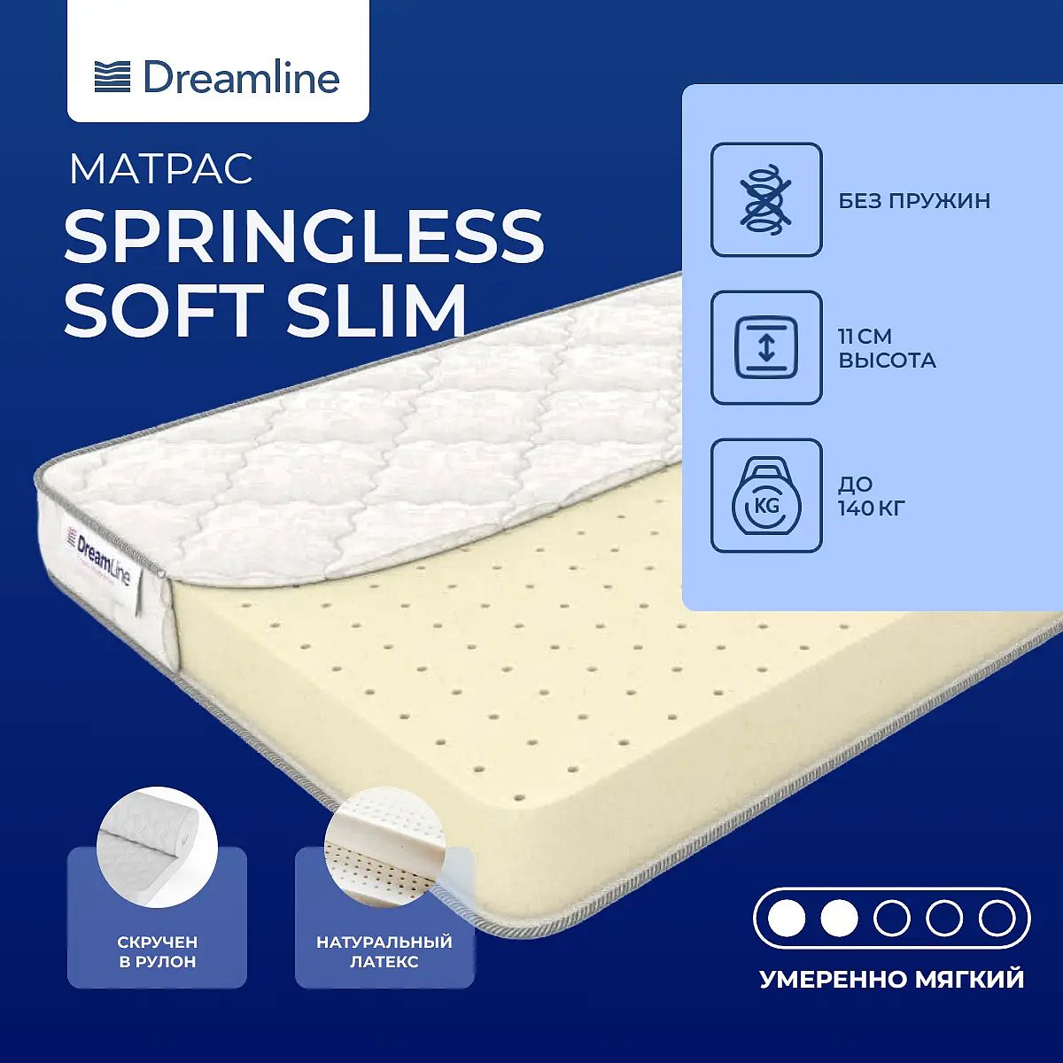 Матрас из монолита латексаЭта модель выполнена из монолита натурального латекса.Латекс представляет собой материал, получаемый путем вспенивания сока бразильского дерева Гевеи. Этот материал является очень популярным наполнителем, он обладает повышенной упругостью и невероятной мягкостью. Кроме того, латекс способен подстраиваться под все изгибы человеческого тела и принимать, таким образом, любую форму. Жаккардовый чехолЧехол матраса пошит из хлопкового жаккарда, простеганного на холлконе.Защита матрасаДля дополнительной защиты спальной поверхности рекомендуем приобретать защитный или водонепроницаемый наматрасник. Он позволит поверхности дольше оставаться чистой и защитит ваш матрас от износа.Скрутка в рулонПо умолчанию матрас поставляется в развернутом виде. По вашему желанию матрас может быть доставлен в скрученном виде.Другие моделиЭтот матрас относится к моделям с повышенной мягкостью, если вы рассматриваете модели пожестче, то посмотрите матрас Dreamline Mix Slim.